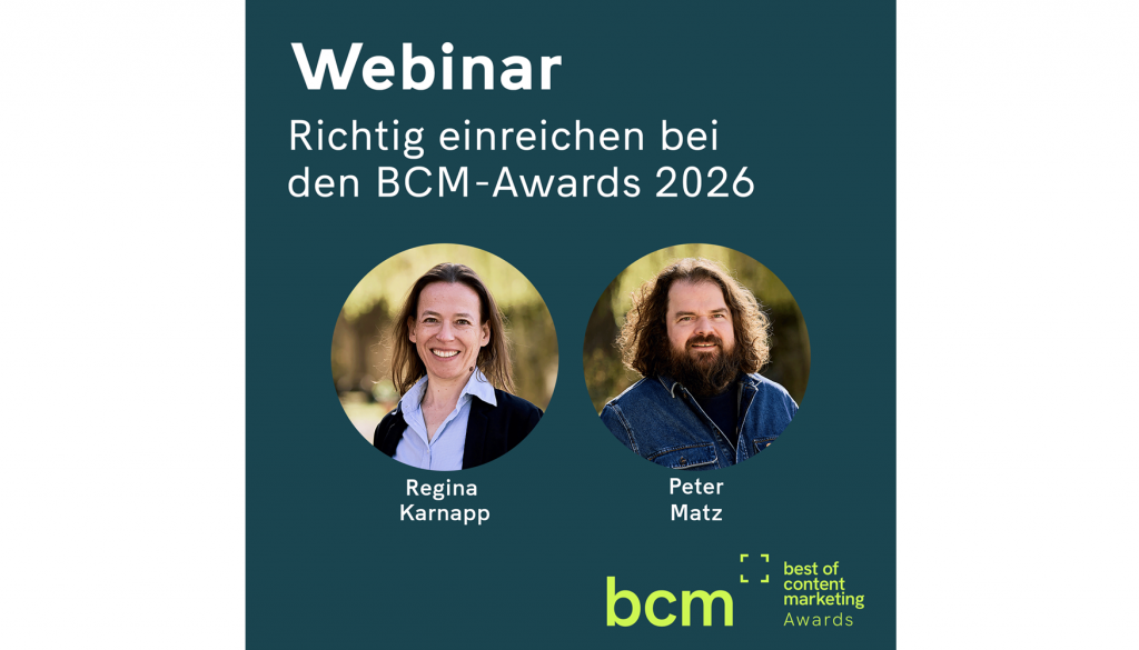 Ab 2. Februar 2026 läuft die Einreichphase für die Best of Content Marketing-Awards 2026. Alle Tipps, Tricks und Kniffe zur Einreichung für den BCM-Award, den Best of Influencer & Content Creators-Award (BICC) und den Best of Corporate Print-Award (BCP) sowie Jury-Insights aus den vergangenen Jahren gibt es im Webinar.