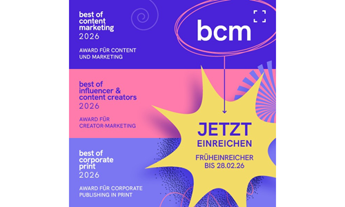 Vom 2. bis 28. Februar 2026 läuft die Früheinreichphase für die Best of Content Marketing-Awards 2026. Alle Tipps, Tricks und Kniffe zur Einreichung für den BCM-Award, den Best of Influencer & Content Creators-Award (BICC) und den Best of Corporate Print-Award (BCP) sowie Jury-Insights aus den vergangenen Jahren gibt es im Webinar.